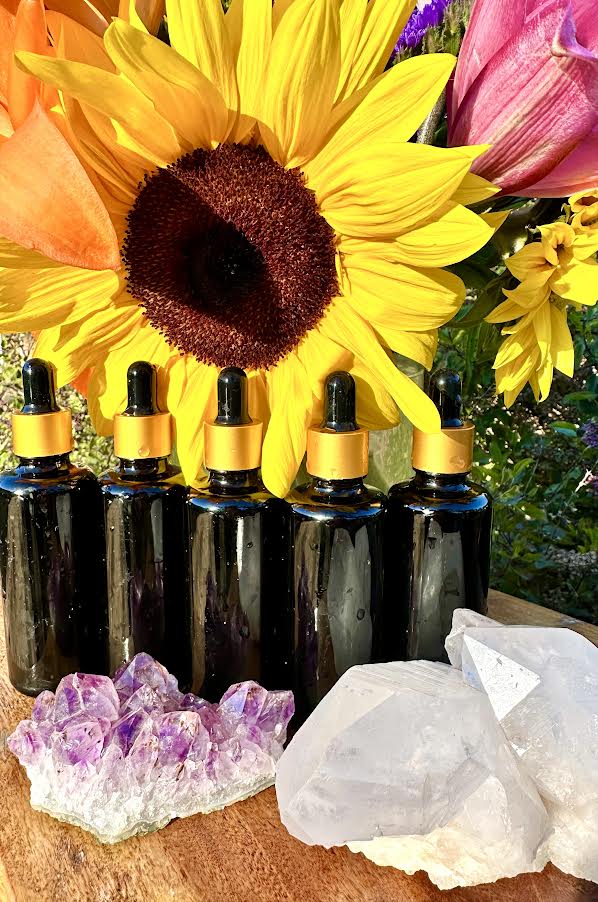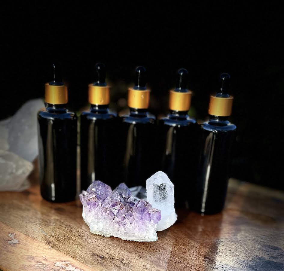 Each bottle contains a rose petal, moonstone, and rose quartz crystal chip to amplify the energy of love, intuition, and womb remembrance.